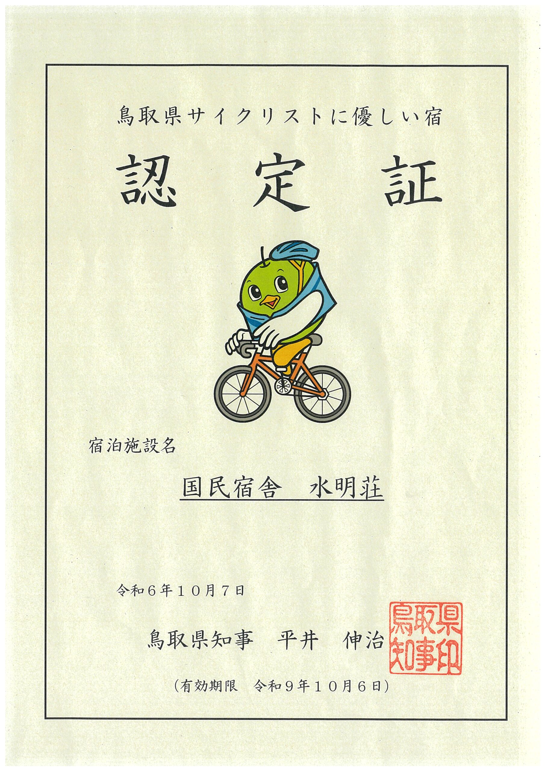 「鳥取県サイクリストに優しい宿」とは、サイクリストが安心、快適に旅の疲れを癒やすことができる環境を備えているとして、県が認定した県内宿泊施設のことです。